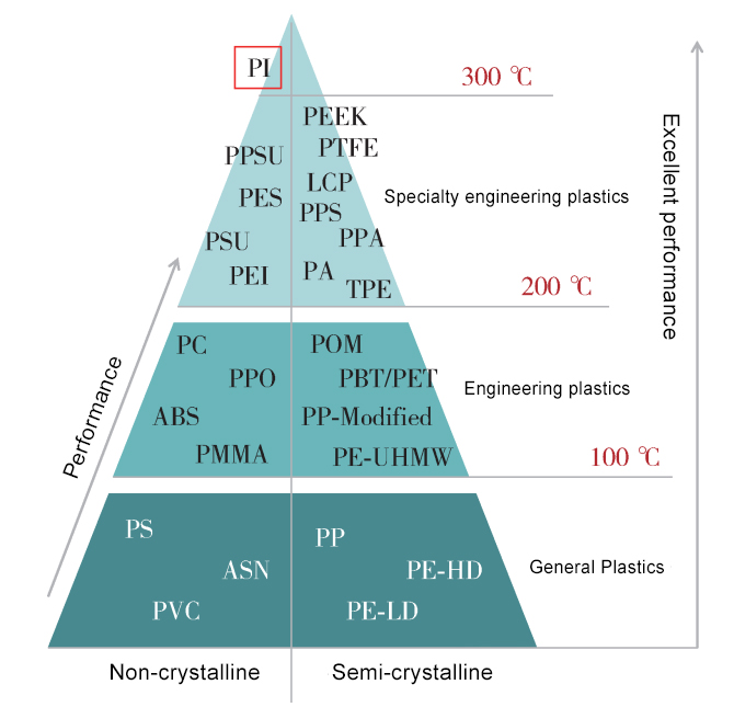 PI is a heterocyclic polymer containing imide groups (—R—CO—NH—CO—R'—) in its molecule, and is one of the polymers with the highest overall performance to date. PI exhibits high temperature resistance (thermal decomposition temperature ≥ 500℃) and low temperature resistance (down to -269℃), with a long-term operating temperature range of -200~300℃; its coefficient of thermal expansion is only 10⁻⁵~10⁻⁷ ℃⁻¹; its dielectric constant at 1000Hz is 4.0, dielectric loss is only 0.004~0.007, and its volume resistivity is 10⁵ Ω·m, classifying it as an F~H insulation; its tensile strength is 100~400 MPa, and its fiber elastic modulus can theoretically reach 500 GPa, second only to carbon fiber (700 GPa); in addition, it has advantages such as radiation resistance, flame retardancy and self-extinguishing properties, and biocompatibility. PI's overall performance ranks at the top of the high-performance polymer material pyramid (as shown in Figure 2).