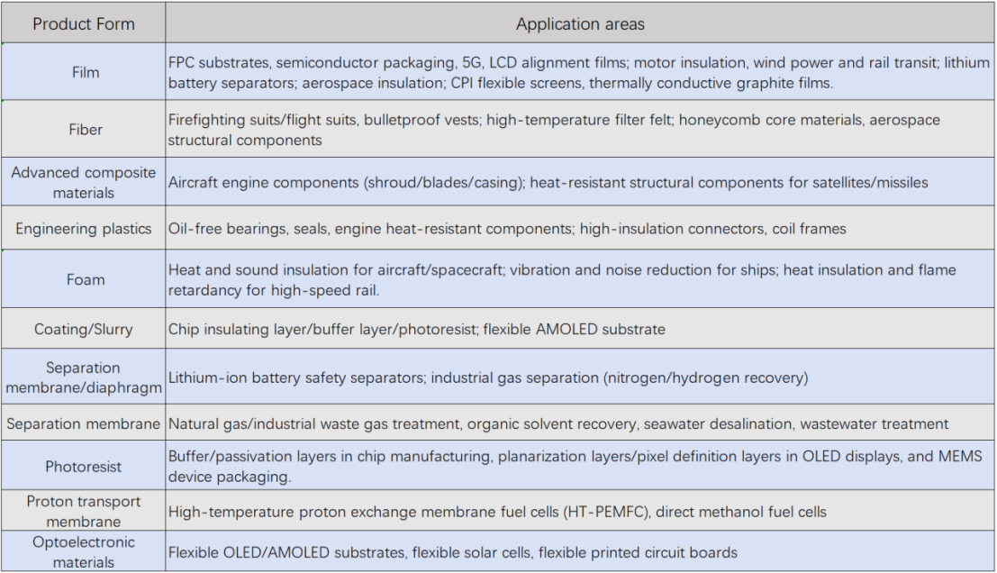 The typical processing model for general-purpose plastics and engineering plastics involves suppliers providing base resins, which are then processed into various products by manufacturers to supply the market. However, PI-related companies mostly integrate material synthesis and product molding, directly supplying products to the market. PI products come in various forms, including films, slurries, resins, fibers, foams, and composites (Table 1), boasting a high diversity of product types, ranking among the top polymer materials.