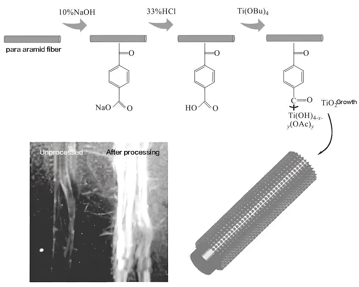 Schematic diagram of the principle of TiO2 surface modification of para-fiber to improve UV resistance
