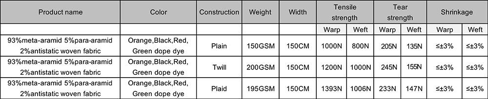 93% meta-aramid fiber 5% para-aramid fiber 2% anti-static fiber blended fabric (aramid IIIA fabric), Which weaved by the yarn in main raw material of meta-aramid fiber Mixed with para-aramid fiber and anti-static fiber through ring spinning.