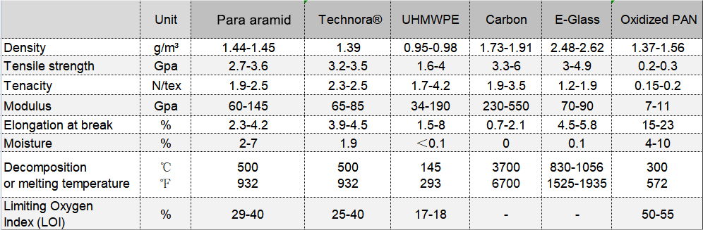 Parameter comparison table between Para-aramid fiber and several high-performance materials